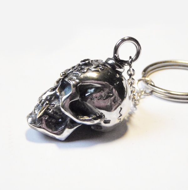 Schlüsselanhänger aus 925er Sterling-Silber mit aufwendig gestaltetem Totenschädel und Stein. Abbildung exemplarisch mit schwarzem Zirkonia.